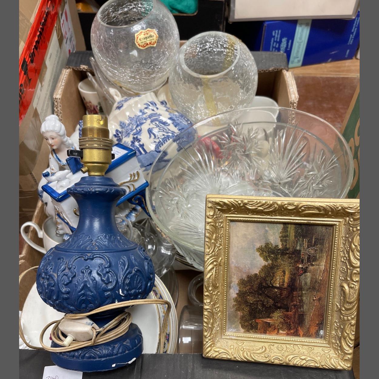 A LARGE mixed box of ceramics to include VINTAGE pressed glass fruit bowls also an unusual blue table lamp and a large blue and white teapot with lid with also a small CONSTABLE modern painting on pottery with gilded frame and lots more