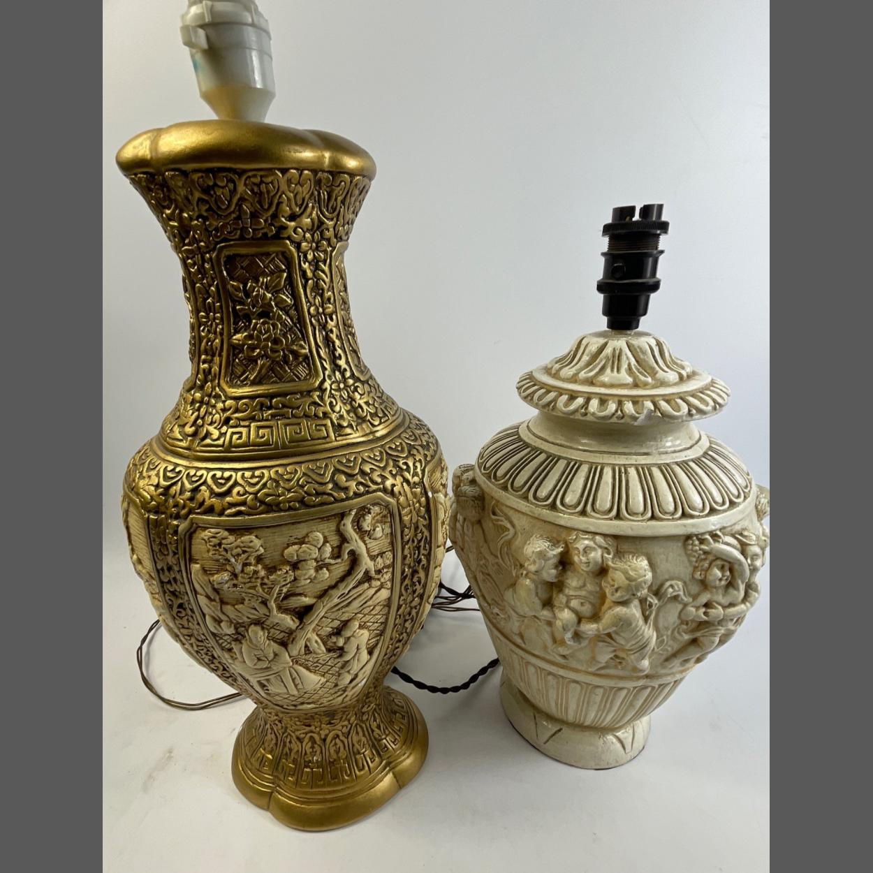 Two VINTAGE table lamps to include a white one adorned with cherubs and the other with traditional Japanese rural scenes with blossom trees / largest item height 47cm - with the right shades these lamps will LOOK FABULOUS!