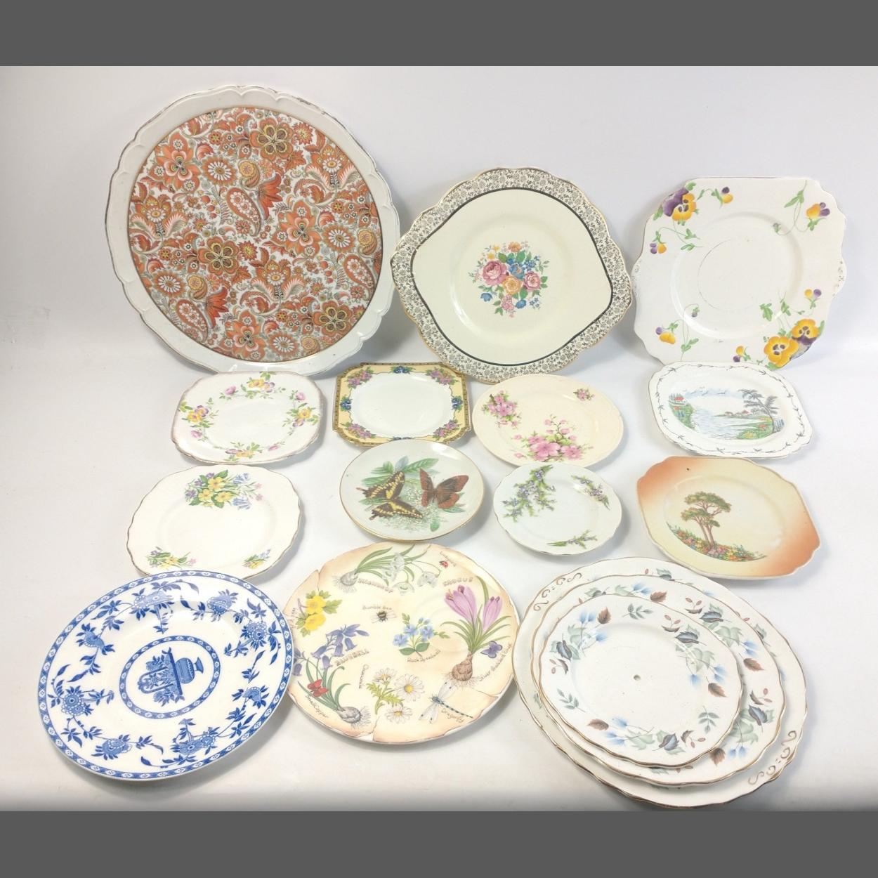 A small collection of decorative china plates including a large LIMOGES Ulim plate 31cm diameter, plus AYNSLEY, COLCLOUGH etc including a three tier cake stand by Colclough minus centre handle