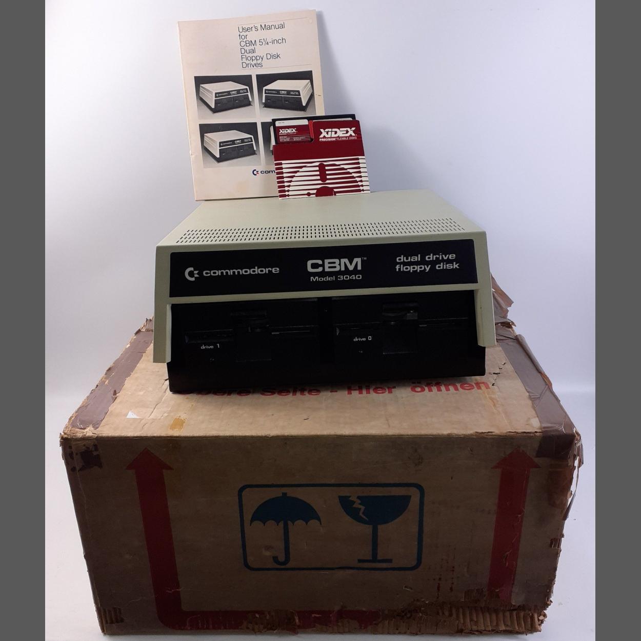 A blast from the past - a CBM 51/4 inch dual floppy disk drives COMMODORE COMPUTER model 3040, boxed complete with instruction manual,