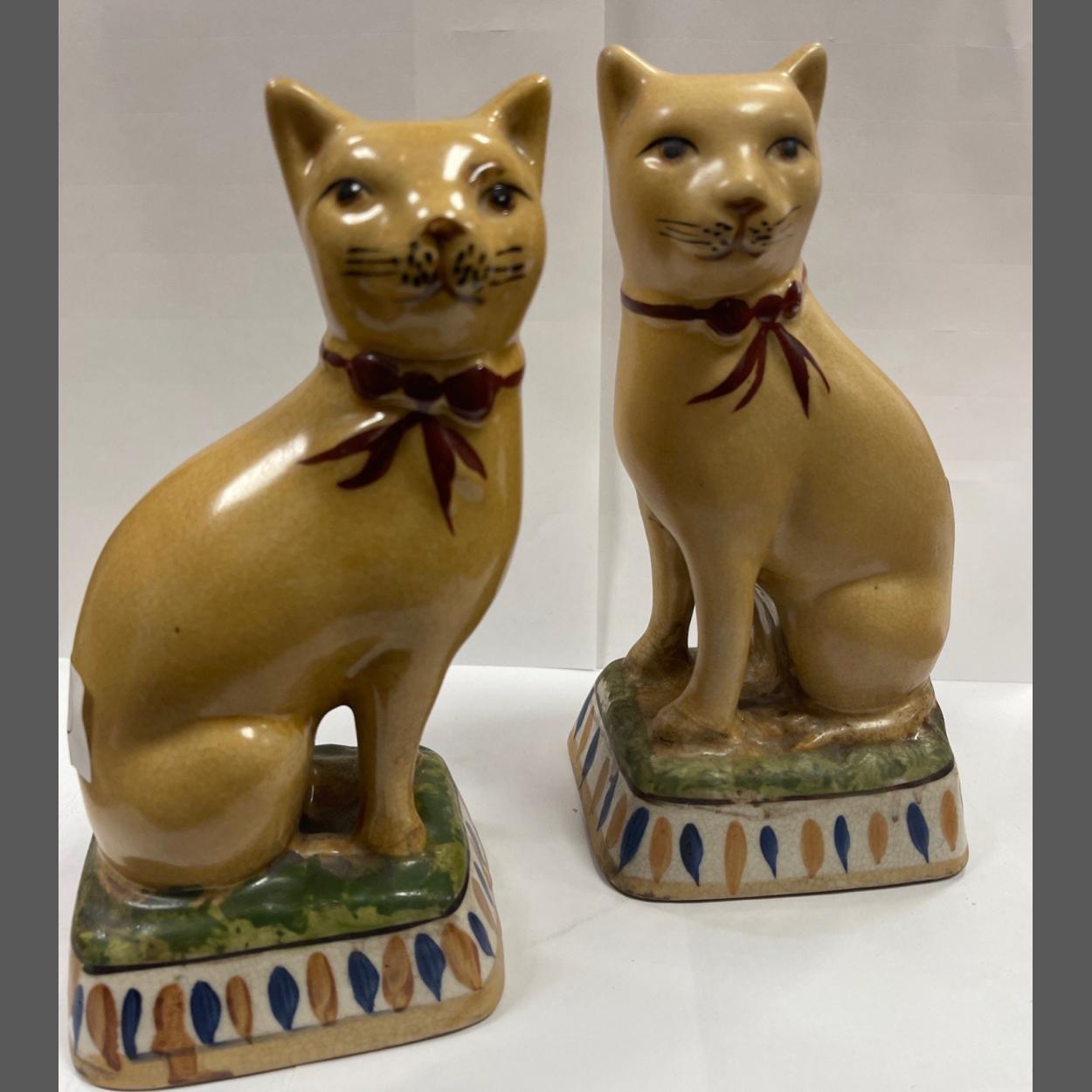 A pair of COLLECTIBLE Vintage STAFFORDSHIRE inspired pottery hand painted sitting cat crackle ware figurines with red-painted bow ties - one is slightly taller than the other probably a male and female version! - slightly taller cat 19cm verses the 18cm female one