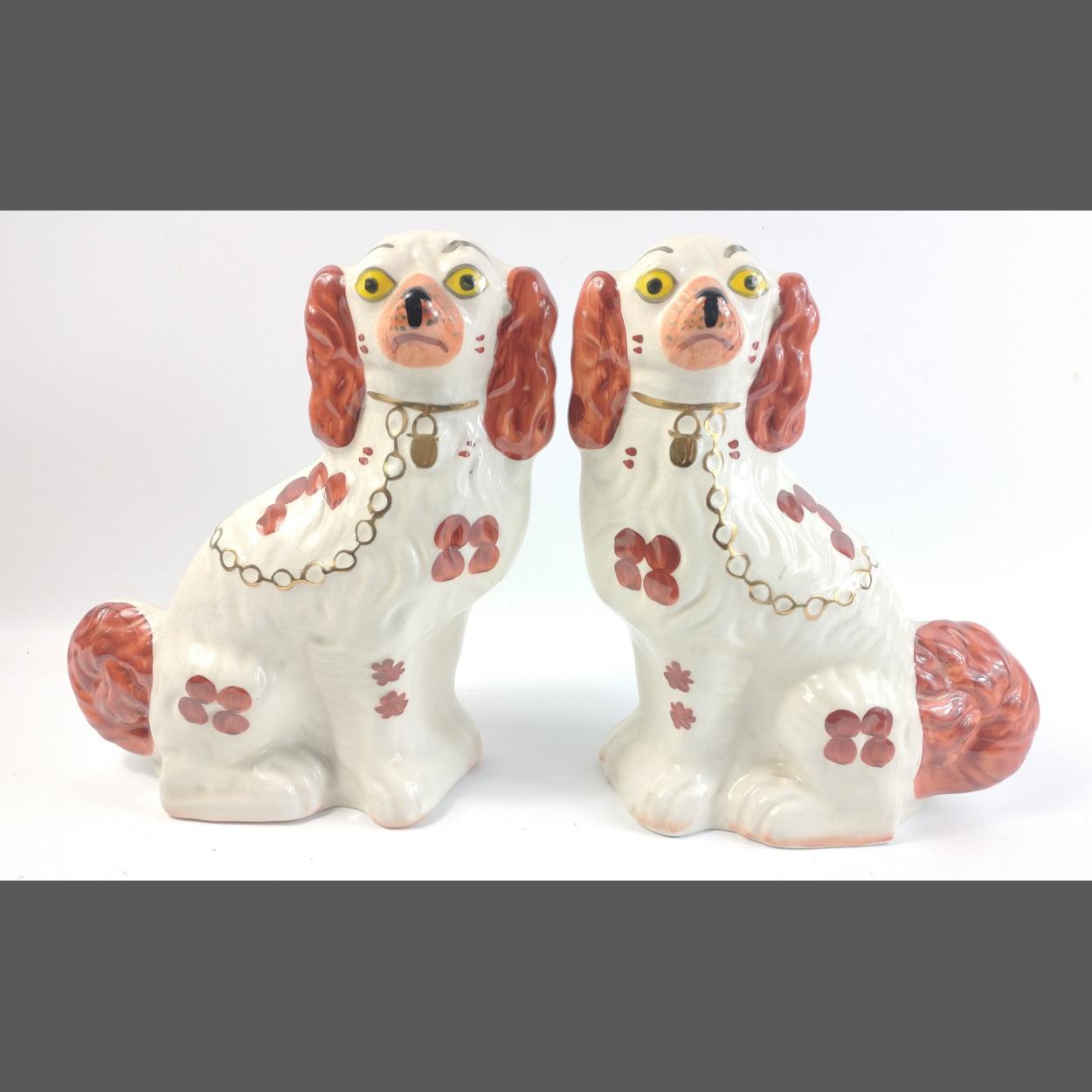 ANTIQUE Hand-painted circa 19th century Staffordshire matched pair of King Charles Spaniel Dog mantle figurines - lovely condition! - dimensions 29cm tall x 23cm wide approx