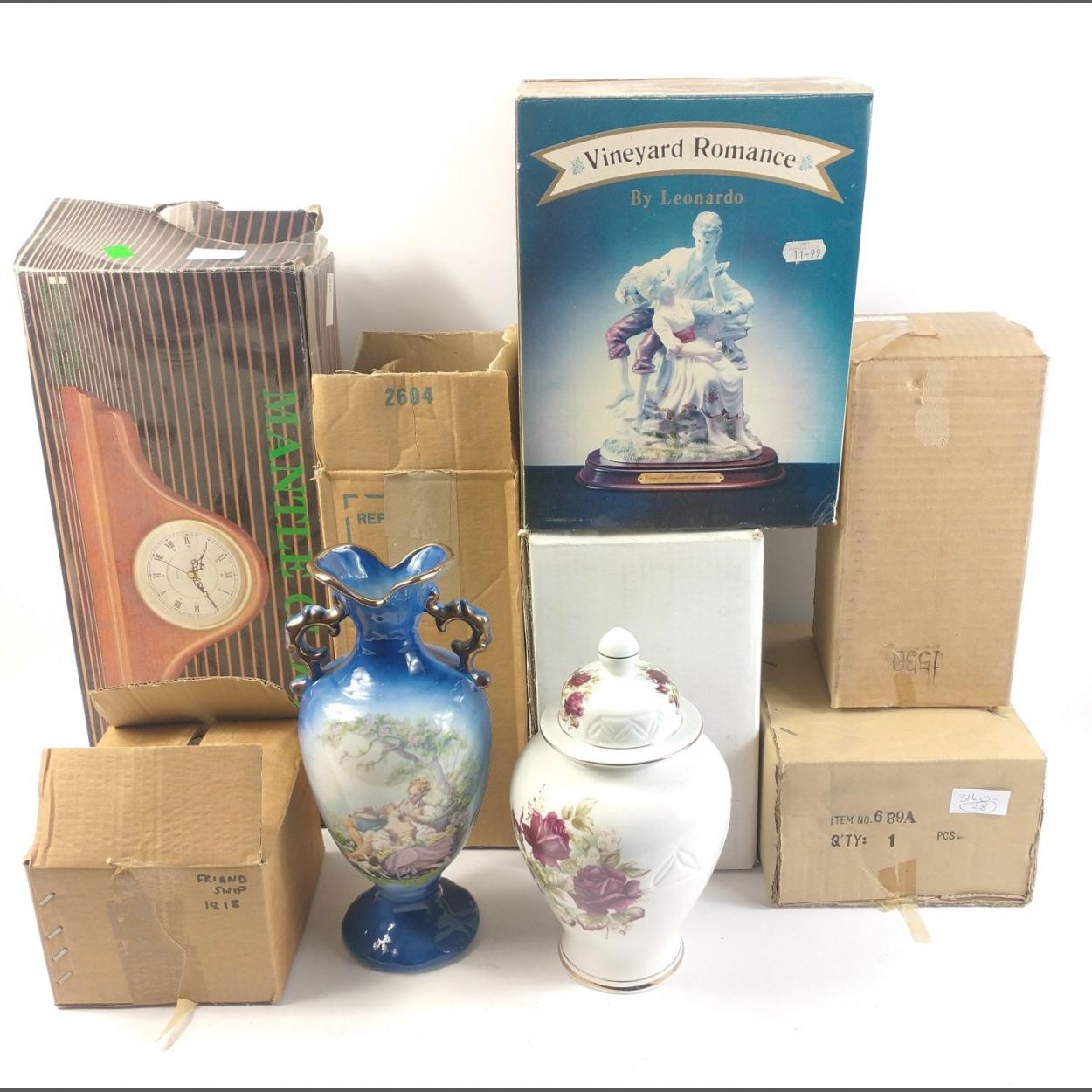 Five boxed ornamental items to include from PAST TIMES 'Friendship' a figurine made in the style of John Walton, stands approx 14cm high, LEONARDO 'Vineyard Romance', approx 23cm tall, a HIGHLANDS mantel clock base approx 40cm long, a LONDON lidded ginger jar with crackle glaze 26cm tall approx, a porcelain vase approx 25cm tall and a blue twin-handled Grecian-style vase