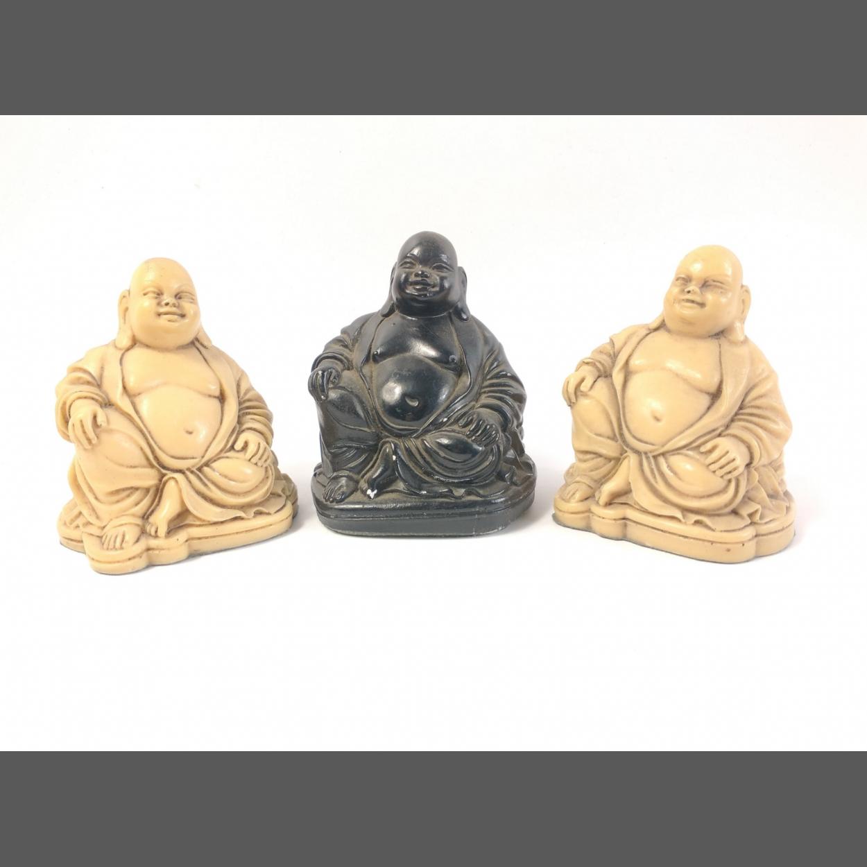A HAPPY TRIO of seated BUDDHA interesting ceramic style ornaments - dimensions each 10cm height x 8.5cm width approx