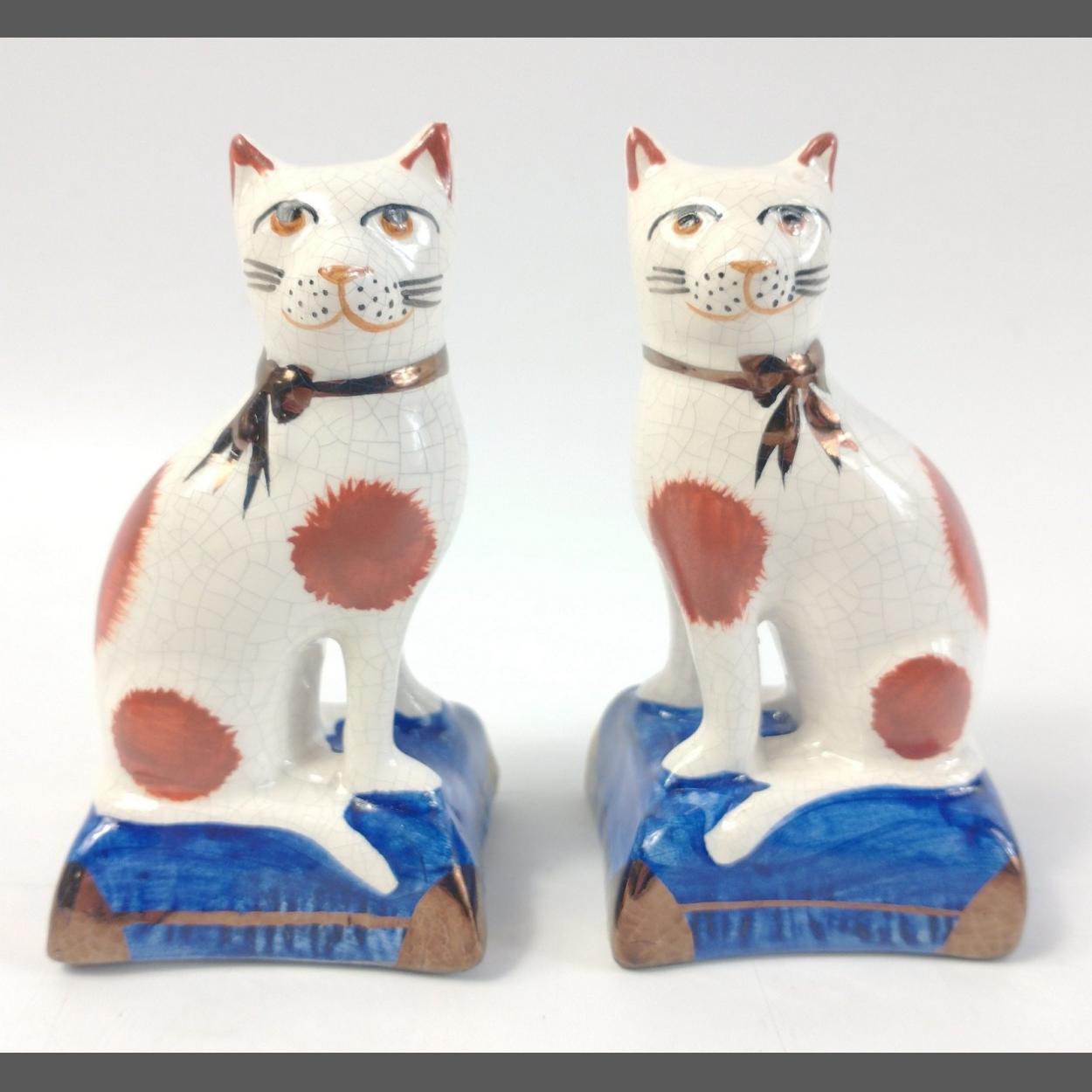 A CUTE pair of small vintage Staffordshire-style pottery hand-painted sitting cats, condition good - dimensions each 10cm height x 5cm base width approx