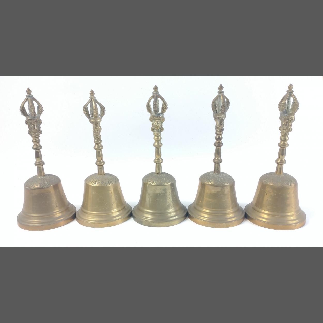 FIVE identical ornamental TIBETAN BUDDHIST MEDITATION brass hand bells - dimensions each 19cm height x 9cm diameter