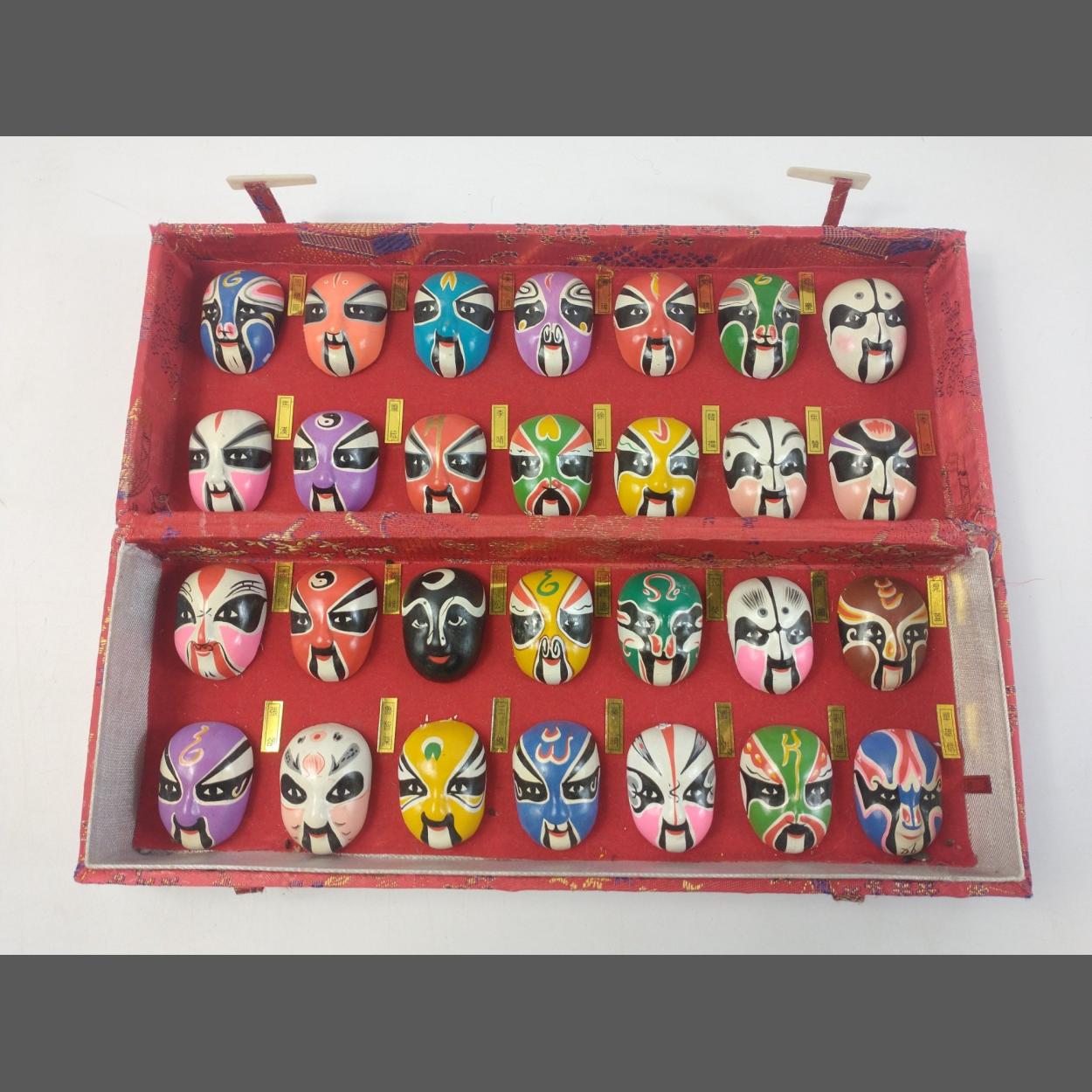A boxed set of 28 hand-painted miniature Chinese opera masks each labelled in Mandarin