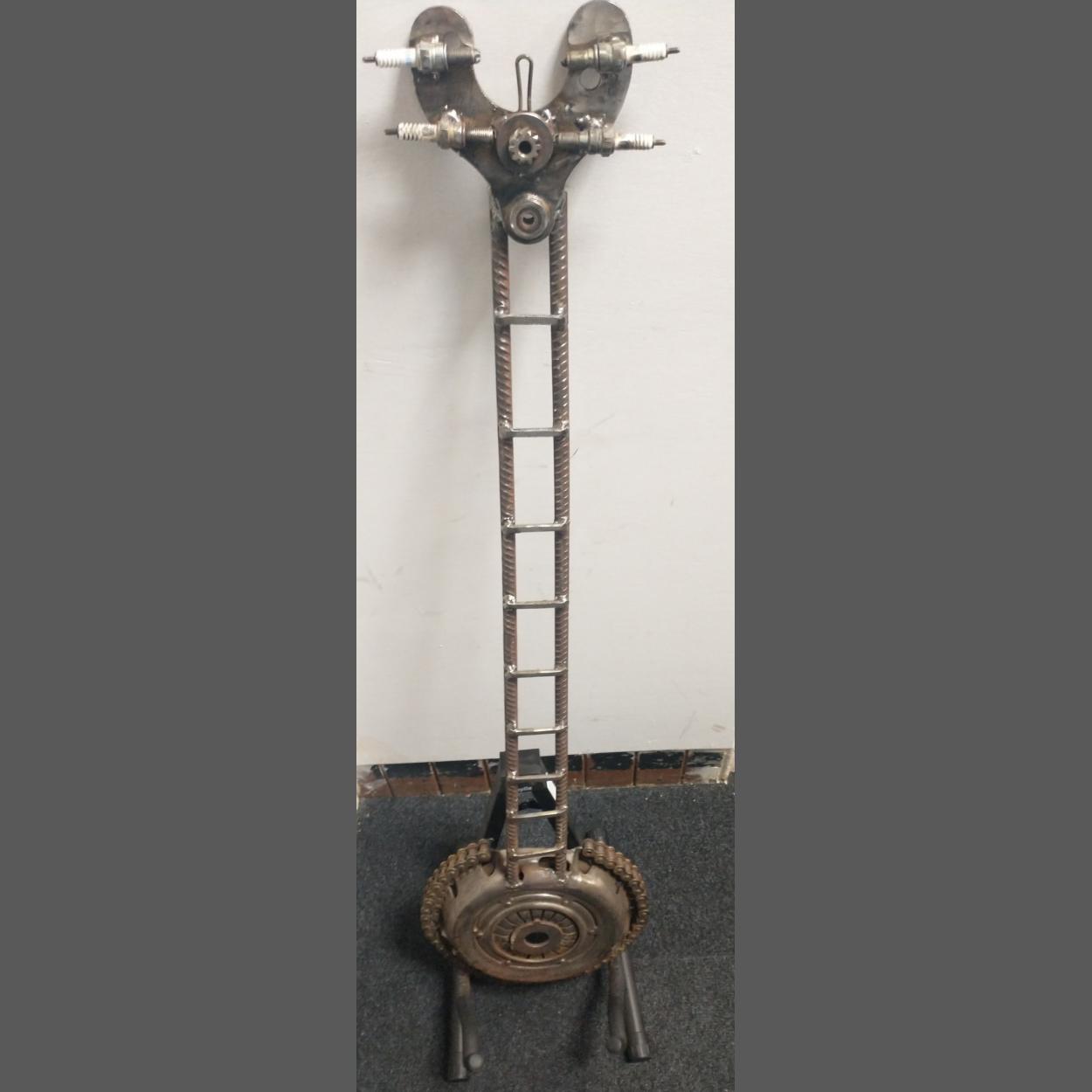 A unique full-sized scrap metal steampunk BANJO made from motor parts comes with stand approx 113cm tall