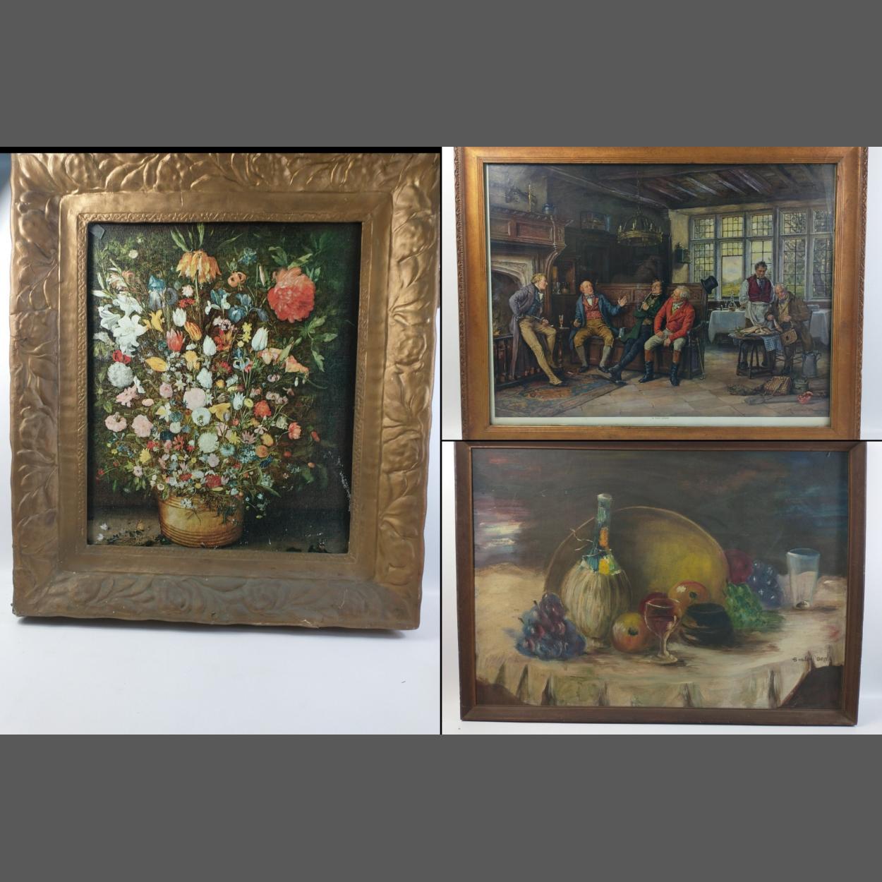 Three nice assorted pieces of artwork comprising an attractive still life oil on board 80x 60cm approx. a print of gentlemen relaxing in a pub style setting measuring approx 70cm x 47cm. Also includes a large frame with a floral display.