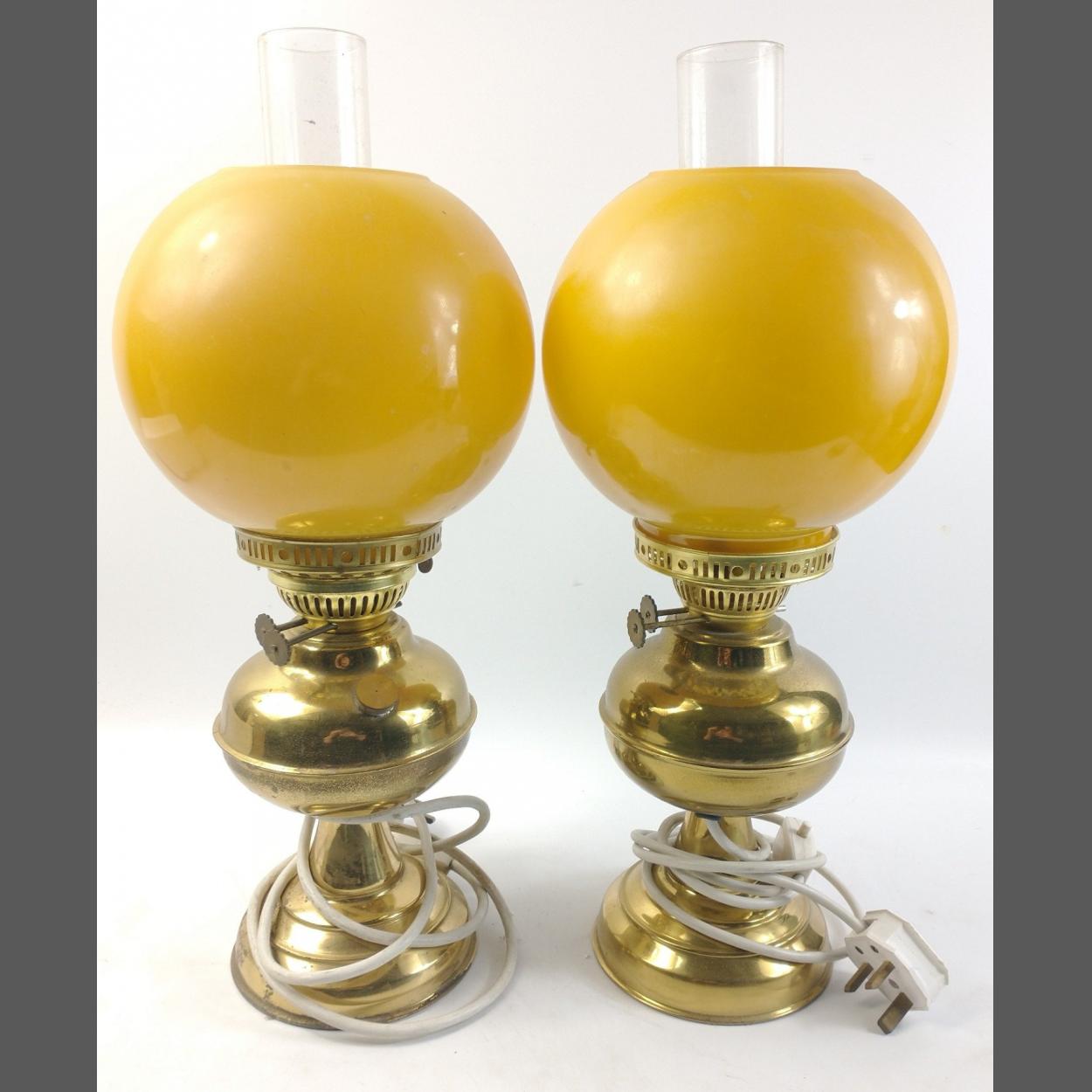 A pair of electrified brass oil lamps with glass globe shades. Both in good order and each stands 45cm high approx.