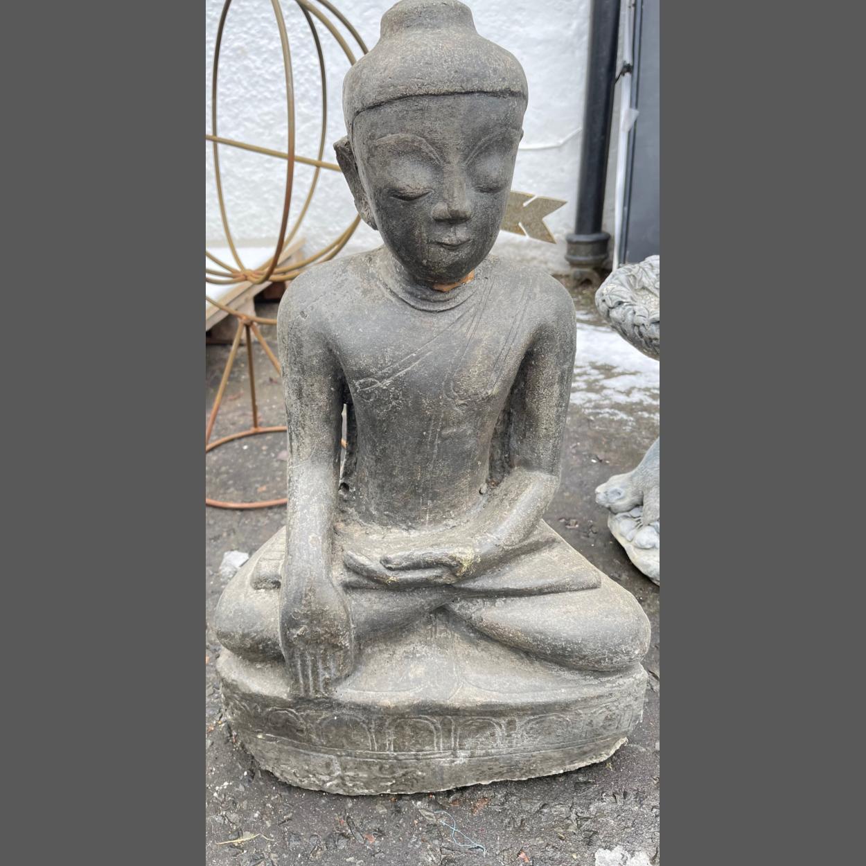 A SUBSTANTIAL stone-effect cast FAR EASTERN BUDDHA - dimensions 60cm tall x 37cm width approx - suitable as a large feature for the garden or as an indoor talking point!