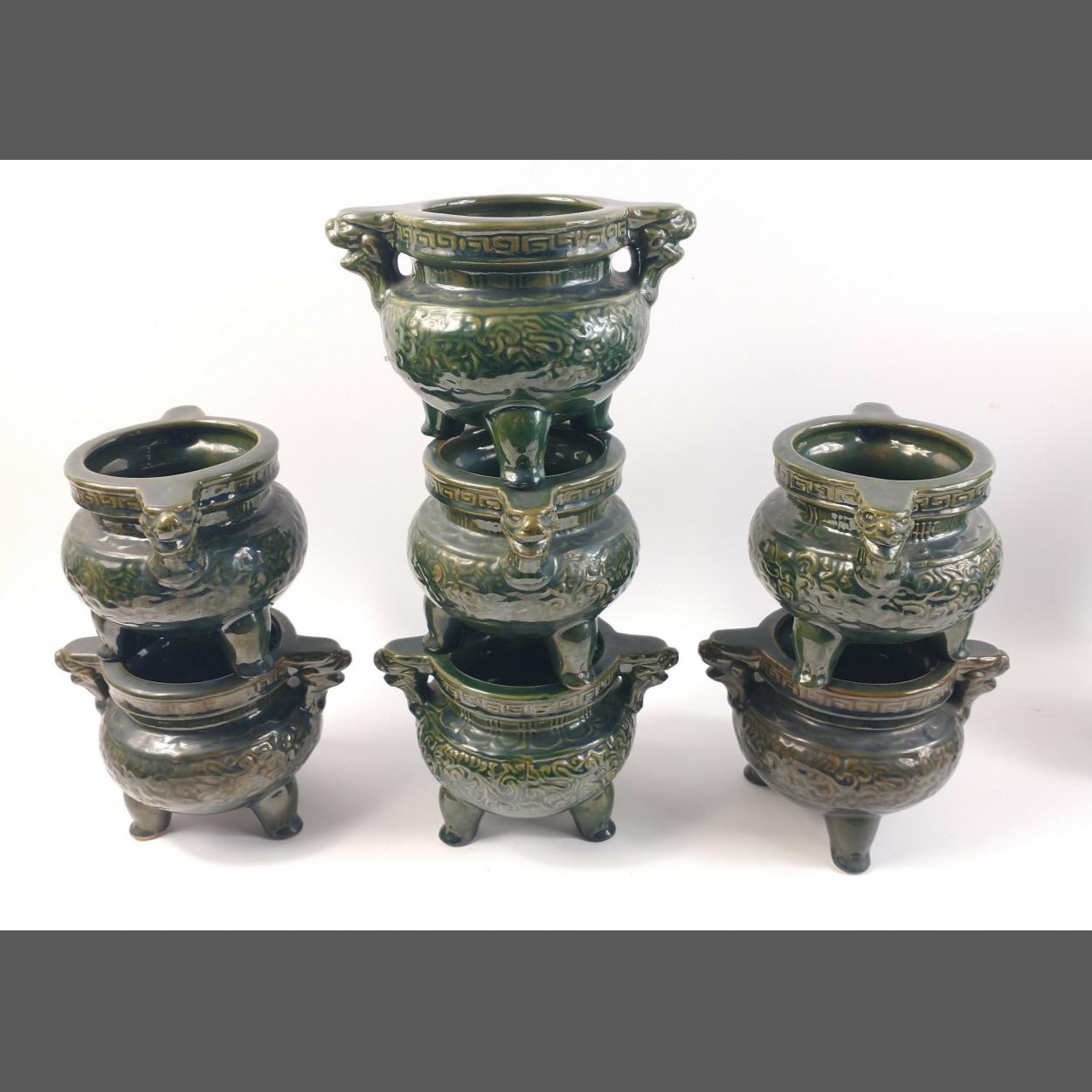 Seven pottery ORIENTAL style pots on raised feet with twin dragon head handles - dimensions 11cm high x 17cm width approx
