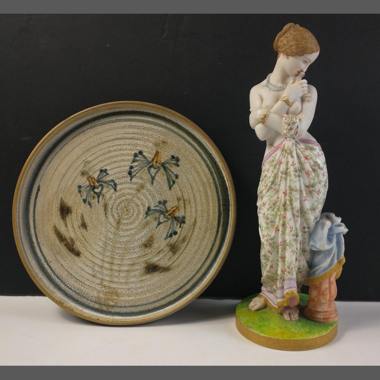 A studio pottery plate from 1979 24cm diameter and a figurine of a lady cradling a bird approx 30cm tall, damage repaired