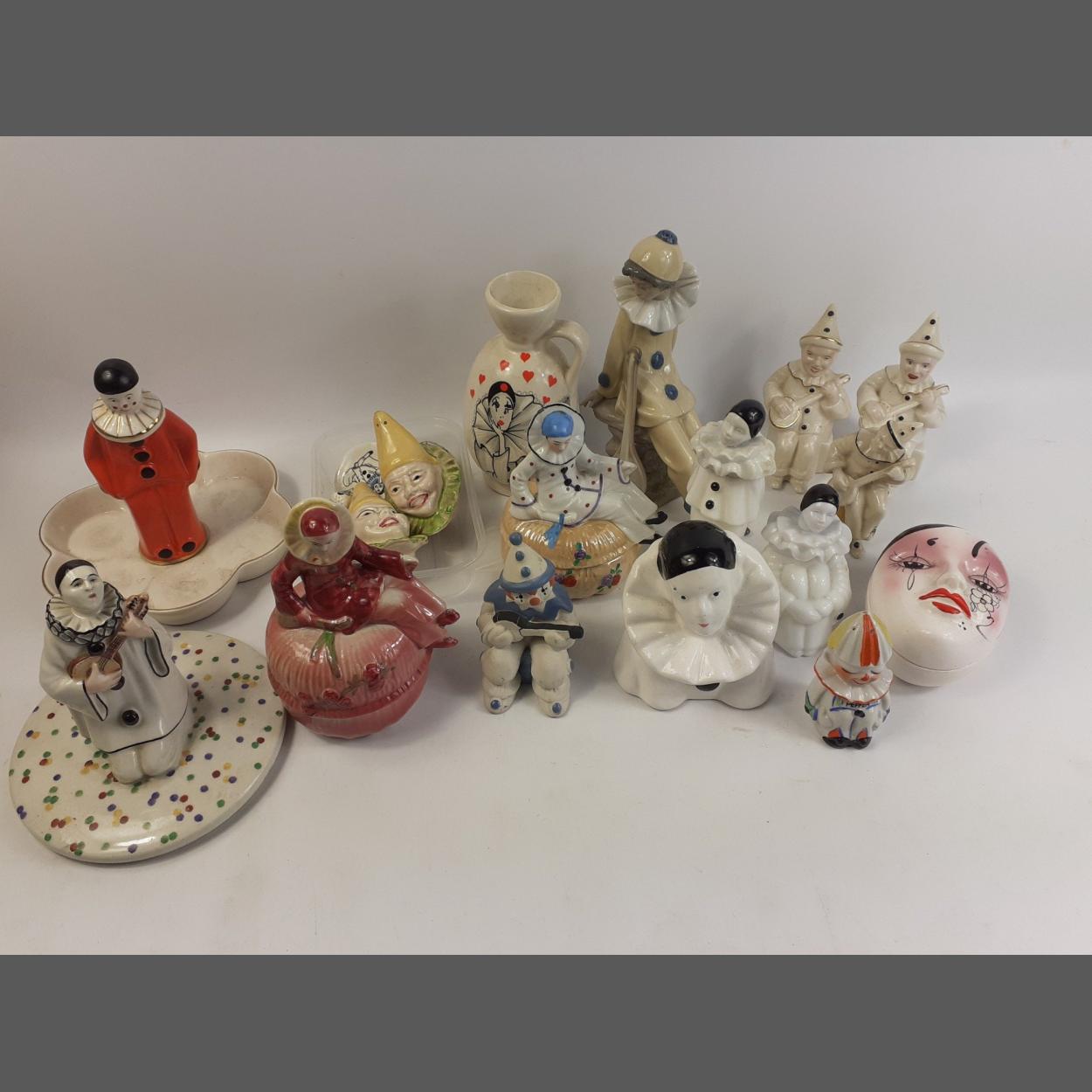 A collection of Pierrot figures including a NAO figure made by Lladro standing approx 22cm tall, salt & pepper sets, powder puff dish, etc