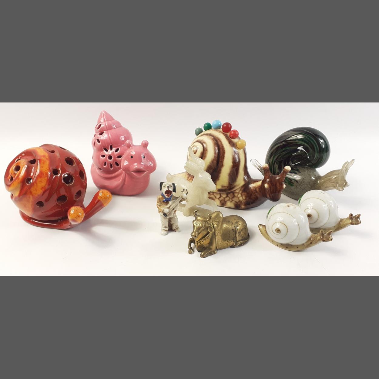 A collection of animal figures including a glass snail (approx 13cm long), a ceramic snail with pickle picks (17cm long), a snail shaped tealight holder, snail shaped salt & pepper set, also a brass Indian water buffalo (7cm long),