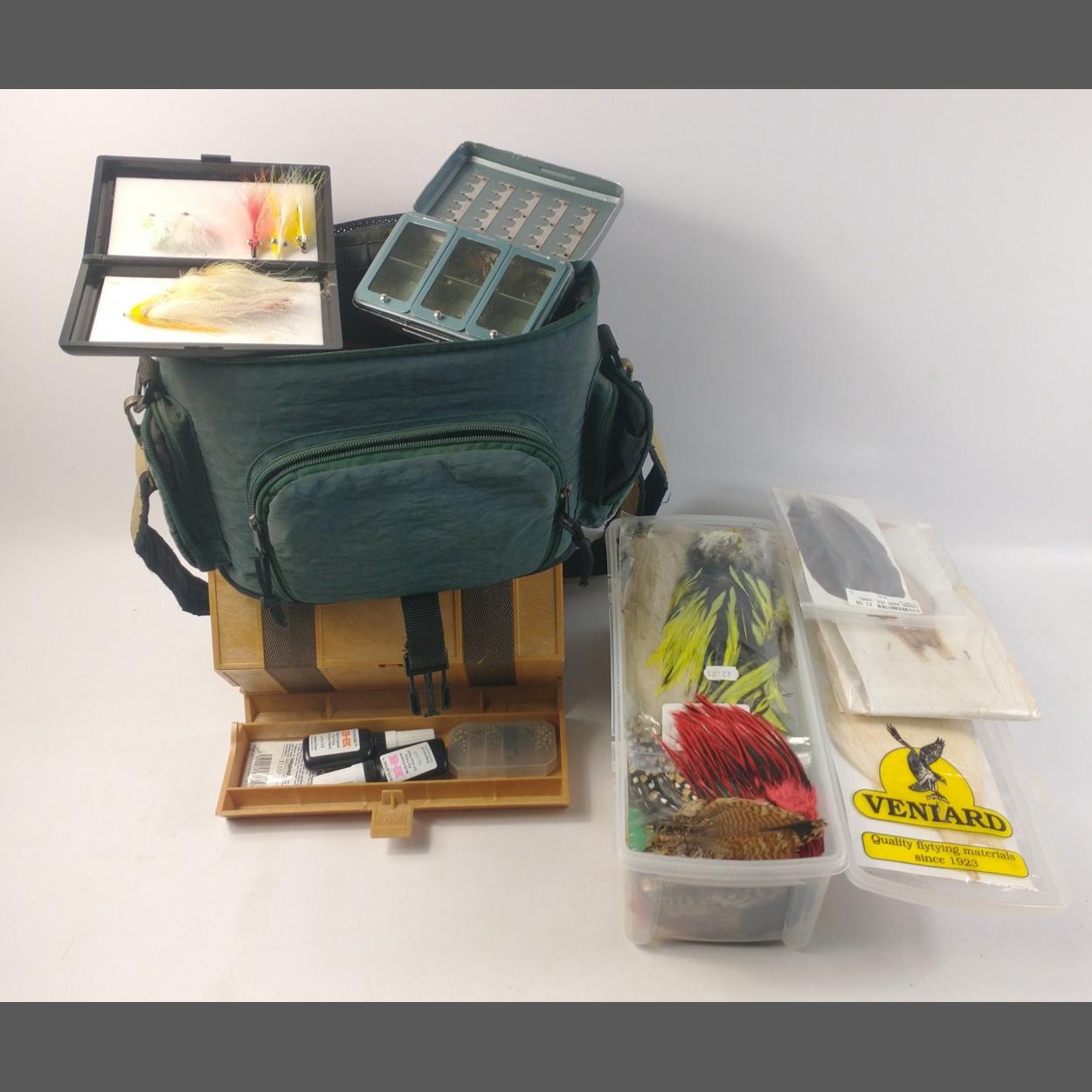 A quantity of FISHING FLY TYING in a roller store case. Includes line and a quantity of wings, hackles and feathers. A nice substantial collevction.