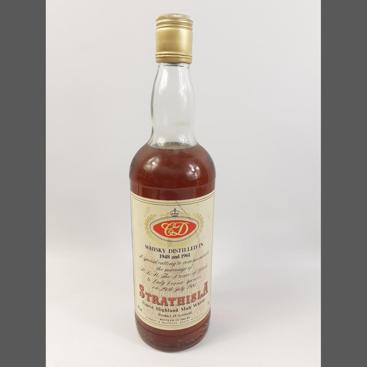A bottle of STRATHISLA finest malt whisky distilled in 1948 and 1961, bottled in 1981 to commemorate the marriage of Prince Charles and Lady Diana Spencer