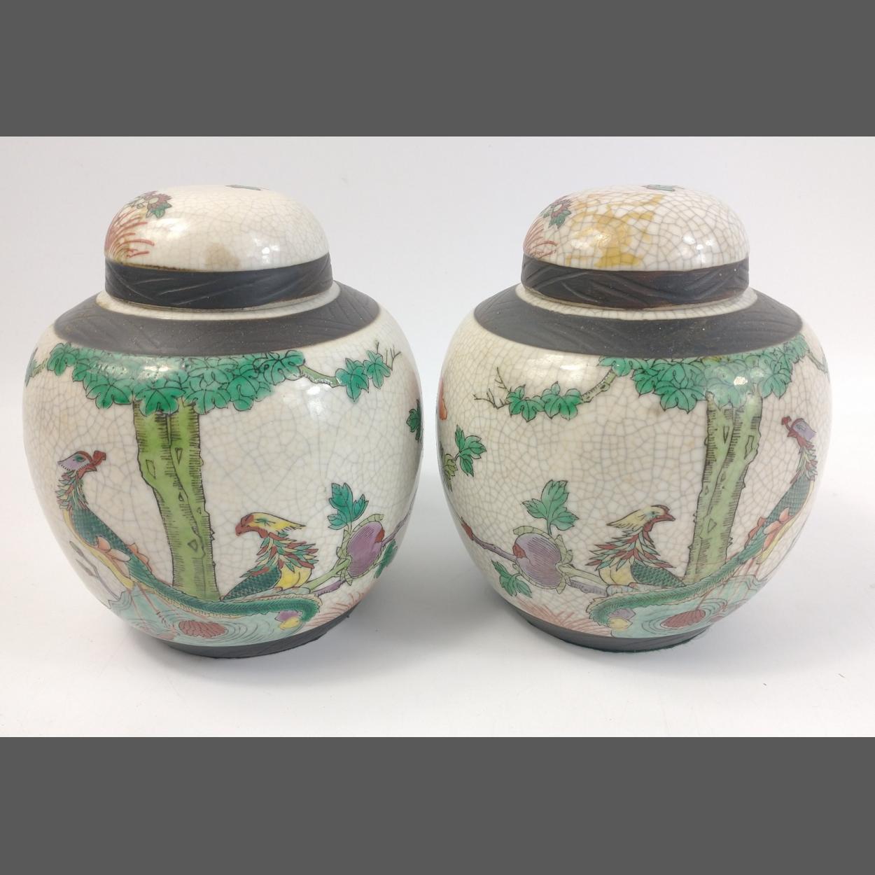 Two vintage Oriental crackle-ware ginger lidded jars depicting traditional hand-painted wild flora and fauna scenes - dimensions 16cm height x 13cm width approx - no signs of damage repair cracks or chips