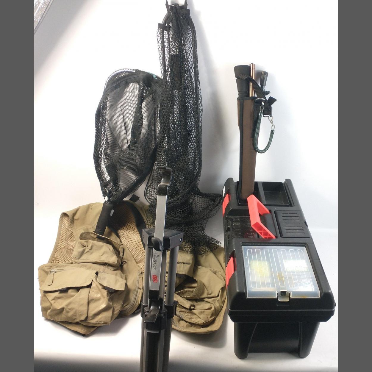A great little collection of quality FISHING equipment to include a tackle box filled with gear, a jacket, a hand net, a landing net, a walking pole and a beach casting rod stand. A great lot.