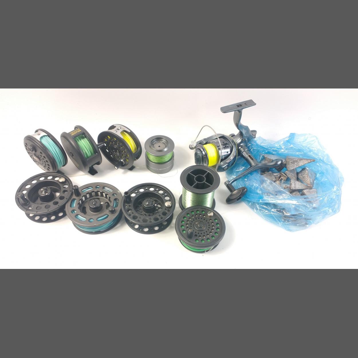 A bag containg a collection of reels, spools and beach fishing weights. To include a Shakespeare Omni XFD, A Masterline Shadow Disc 7/8, a Shakespeare Professional 2528 and others.