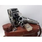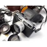 A collection of camera and photographic items. To include a YASHICA ELECTRO 35 in case with Japanese YASHINON DX 1:1.7 45mm Lens. A further case containing a YASHIKOR 1:4 Wide Angle and a YASHIKOR 1:4 Telephoto lens. All lens are internally clear, clean and undamaged. Also includes a cased BOLEX PAILLARD movie camera with accoutrements.
