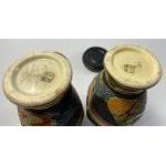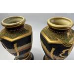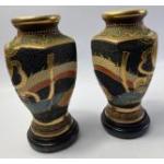 A pair of old decorative JAPANESE SATSUMA VASES on dark wood stands - dimensions each vase 20cm tall x 12cm diameter approx