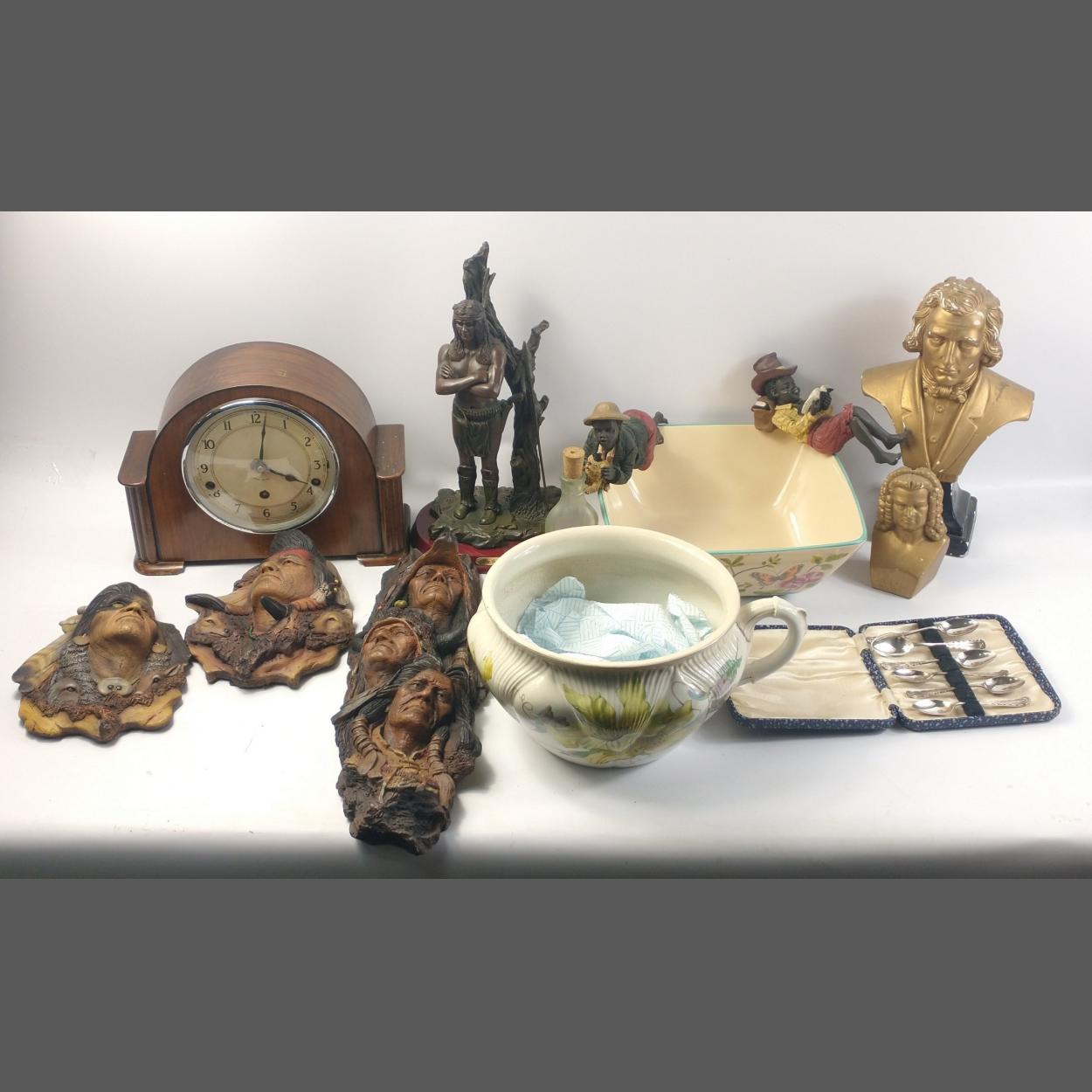 A quality mixed box to include wall plaques by Collectible World Studios 'Patient Wind' , Autumn Wind dimensions each 20cm x 17cm approx, another Red Indian wall plaque possibly same maker 42cm height approx, other models to include a standing Native American Indian Brave Warrior on a plynth 33cm tall, two busts, a VINTAGE FOLEY china chamberpot and a vintage mantle clock etc