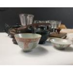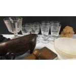 A mixed box to include a small jet teapot and milk jug (chip to spout of jug), 2 sets of four crystal liqueur glasses, a glass chalice (16cm high), a small Chinese bowl (9cm dia) and sauce bowl (8cm dia), a vintage ink blotter, a frosted marble bowl (15cm dia), a reproduction Davenport serving dish garnished with grapes (28cm long), a carved wooden figure (13cm long)with damaged foot, a carved wooden hippo (30cm long) largely toothless
