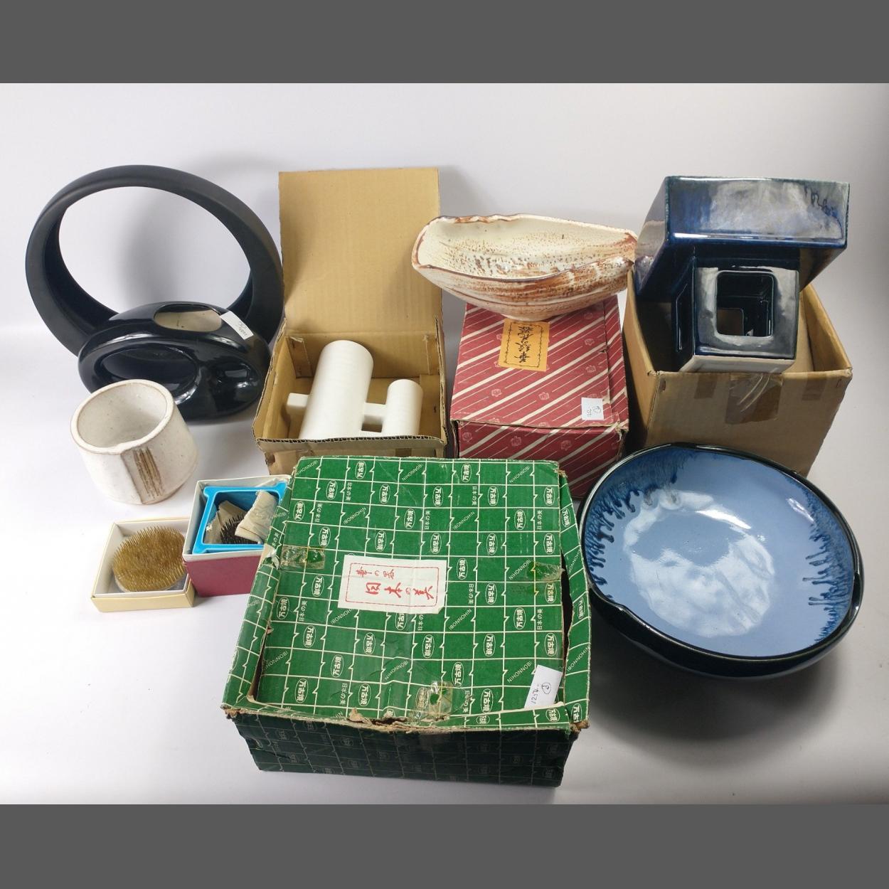 Resources for Ikebana flower arranging to include six unusual-shaped vases and 2 needle frogs,