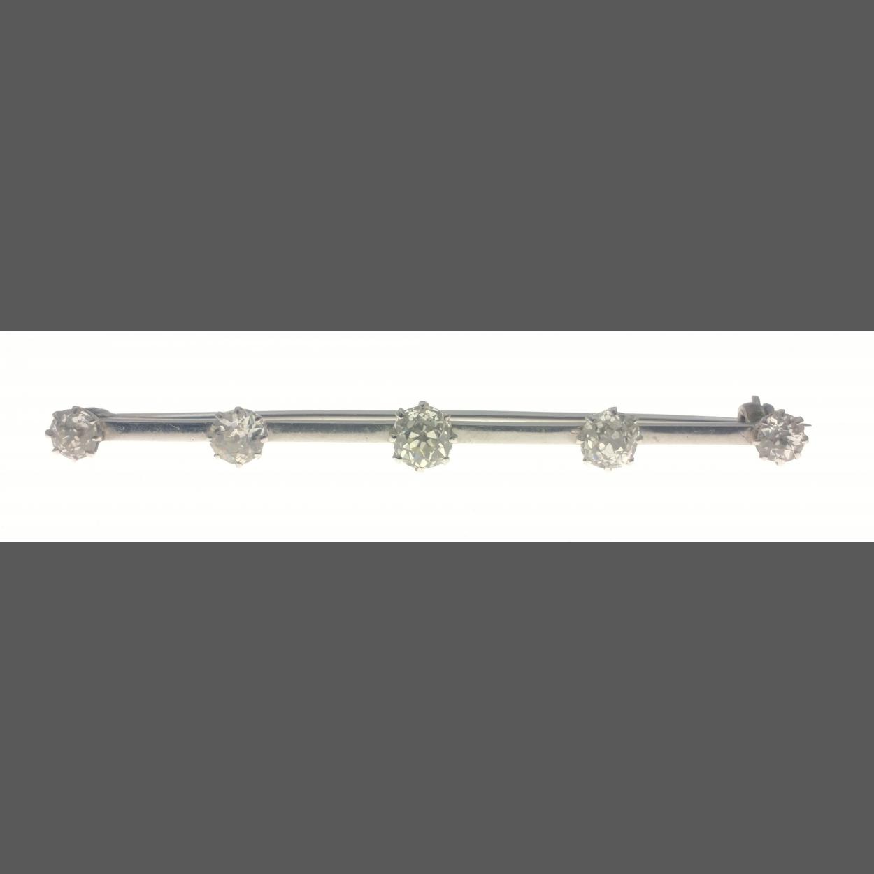 DIAMONDS ARE A GIRLS BEST FRIEND - A beautiful FIVE SUBSTANTIAL Diamond(tested) studded bar brooch/or tie-pin on unmarked white metal - The diamonds are arranged with a centre diamond dimensions 5mm diameter x 3mm depth approx, the two inner diamonds flanking the central diamond dimensions 4mm dimaeter x 2mm approx and lastly the two outer diamonds dimensions 3mm depth diameter x 3mm depth approx - length of brooch 6.5cm - gross weight 6.045g approx this was evidently privately commissioned