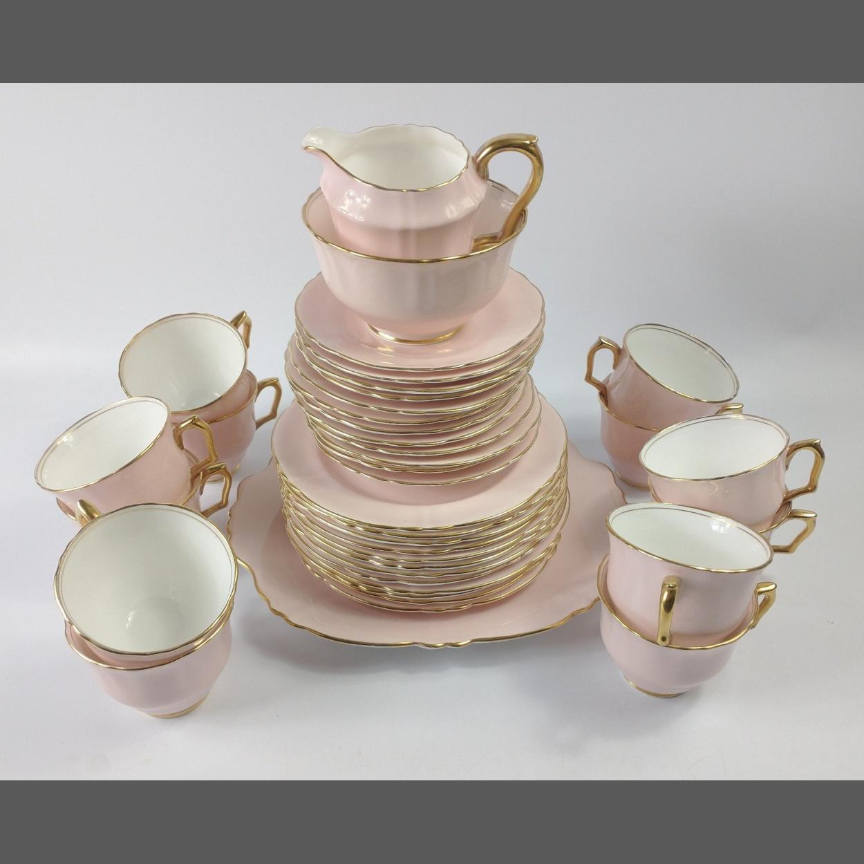 Pretty in pink - a CROWN STAFFORDSHIRE tea service in pink with gilt edging to include, 12 teacups, 12 saucers, 12 side plates, 1 cake plate, 1 milk jug and 1 sugar bowl, good condition