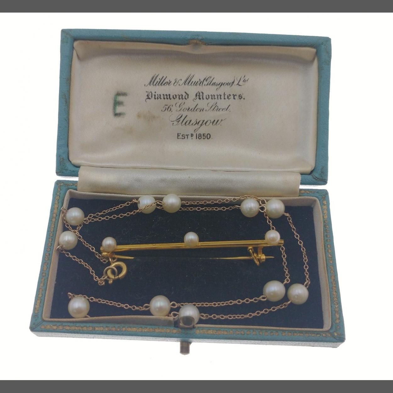 A 9c stamped bar brooch with a trio of pearls 5cm diameter and gross weight 2.12g with an unmarked yellow metal pearl necklace gross weight 3.85g approx