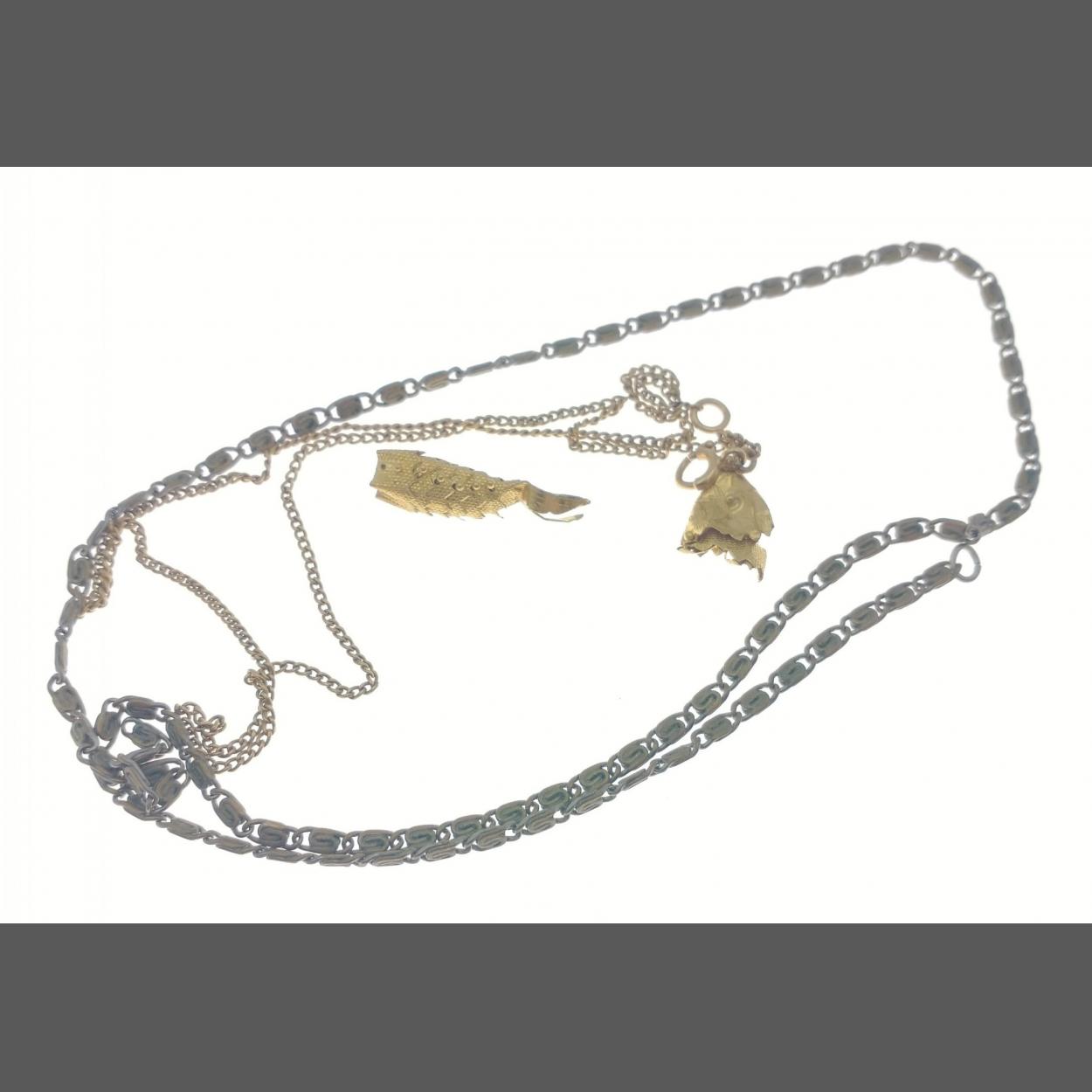 A 9ct stamped chain with a broken articulated unmarked yellow metal fish pendant (purchased from Thailand) gross weight 4.39g with a costume chain necklace
