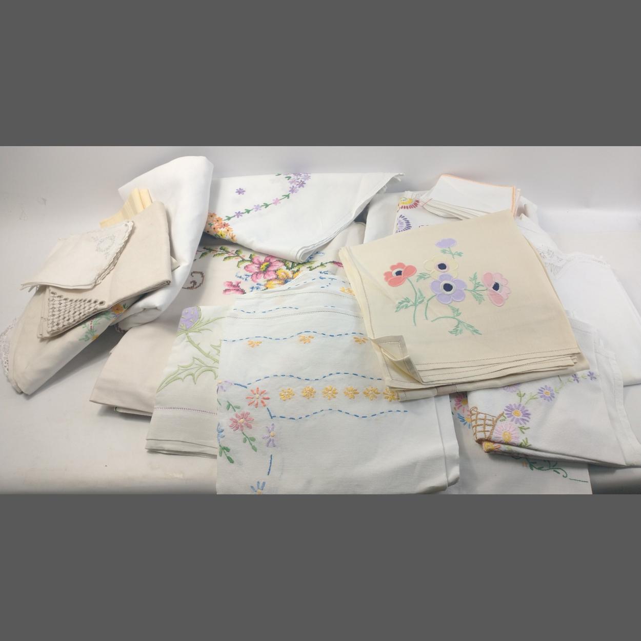 A large quantity of quality linens embroidered, with cross stitch, cut work and applique. Sizes include tea table and dining tables sizes plus matching napkins and three tea cosies