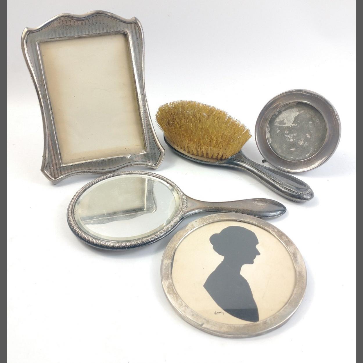 A silver backed hairbrush and hand mirror inscribed 'Lily', indistinct Birmingham hallmark gross weight 330g approx, plus 2 silver framed photo frames, Birmingham hallmarked, 10cm dia and 18x15cm approx, gross weight 247.5g approx and a silhouette in a round hallmarked frame, Birmingham 1921, gross weight 79.5g