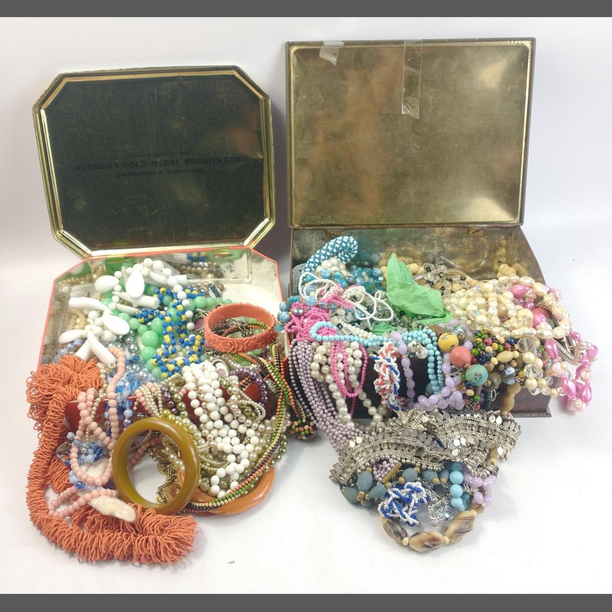 A glorious collection of costume jewellery in two tins, mostly string beads of all colours