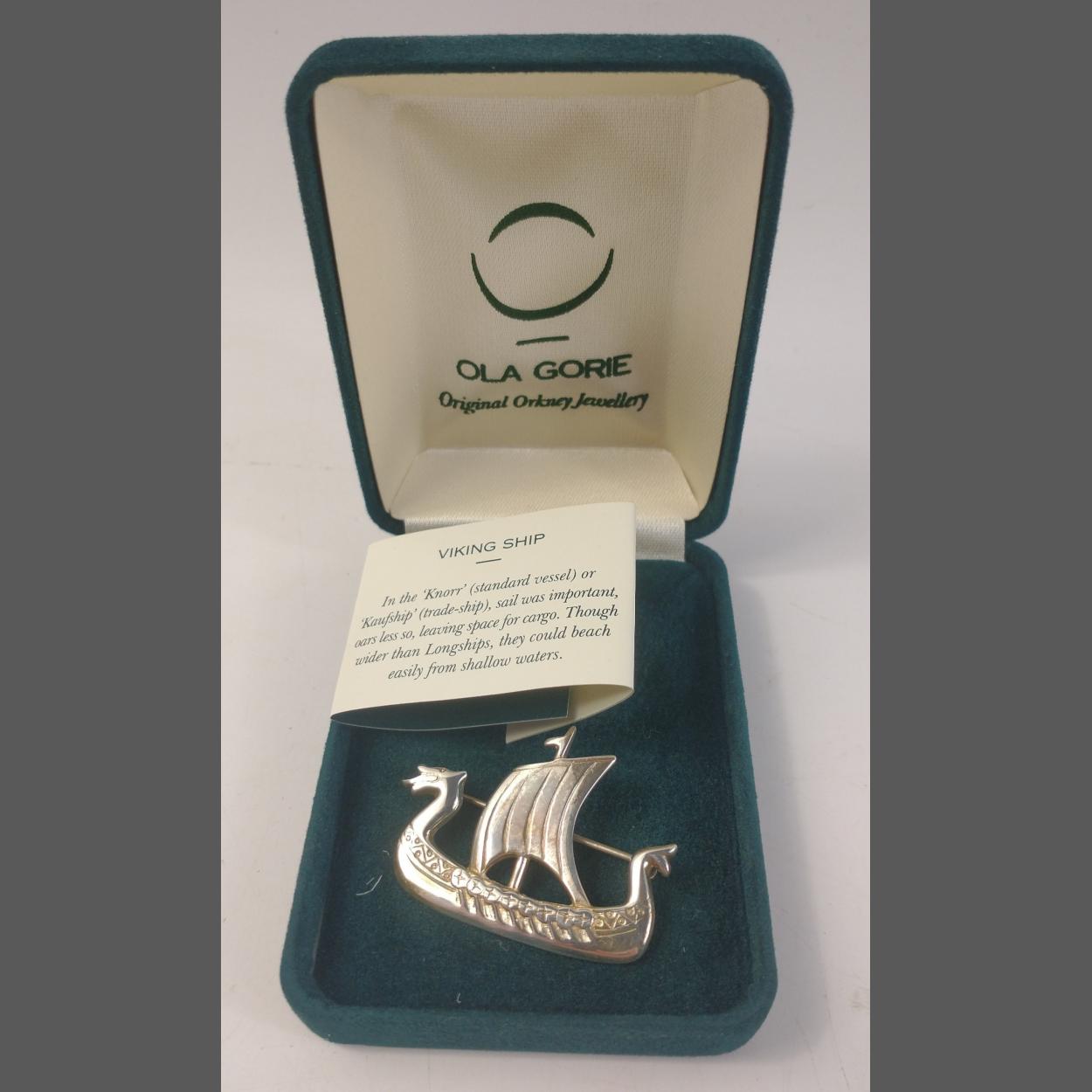 A SILVER OLA GORIE stamped viking ship in full sail - still within its original green velvet jeweller's box