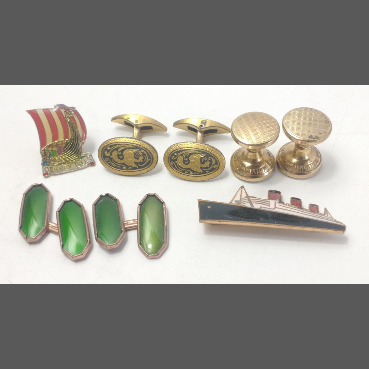 Three pairs of yellow metal cufflinks with a VINTAGE Stratton Ocean Liner pin badge with also an ORKNEY ISLES small pin badge