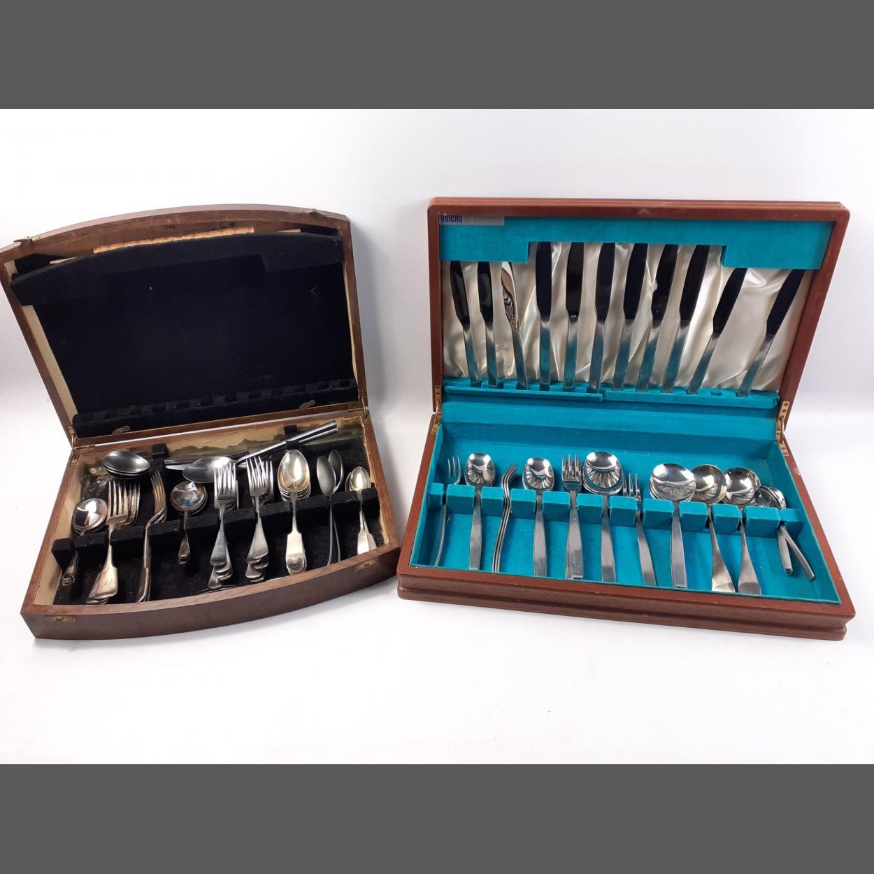 Two wooden canteens of cutlery, one containing an almost complete set of VINER'S, the other with more of a mixture including some EPNS