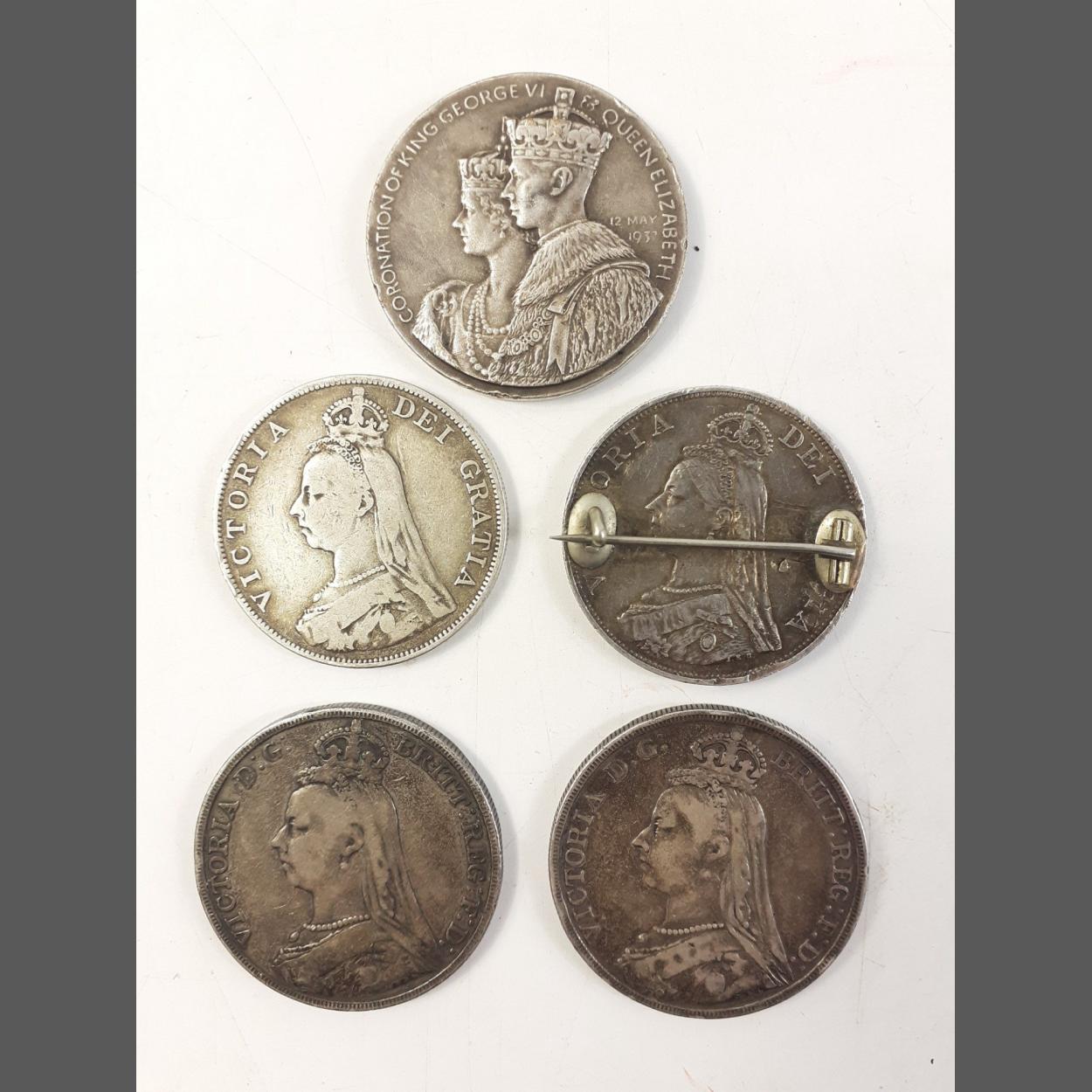SILVER TREASURE LOT to include four VICTORIA CROWNS, one set as a brooch and a 1937 Coronation medal. Nice lot, weighs 130g in total approx.