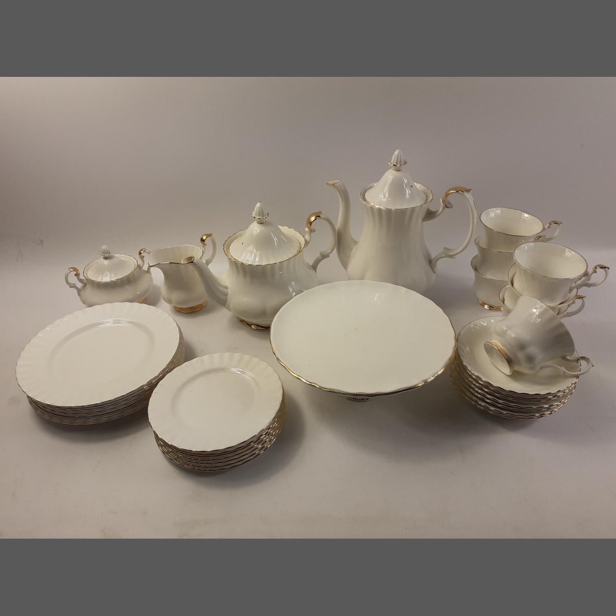 In lovely condition and matching any décor a ROYAL ALBERT VAL D'OR tea/coffee service comprising 7 cups and saucers, 7 side plates, 1 teapot,1 coffee pot, 1 milk jug, 1 lidded sugar bowl, 1 raised cake plate, no visible damage