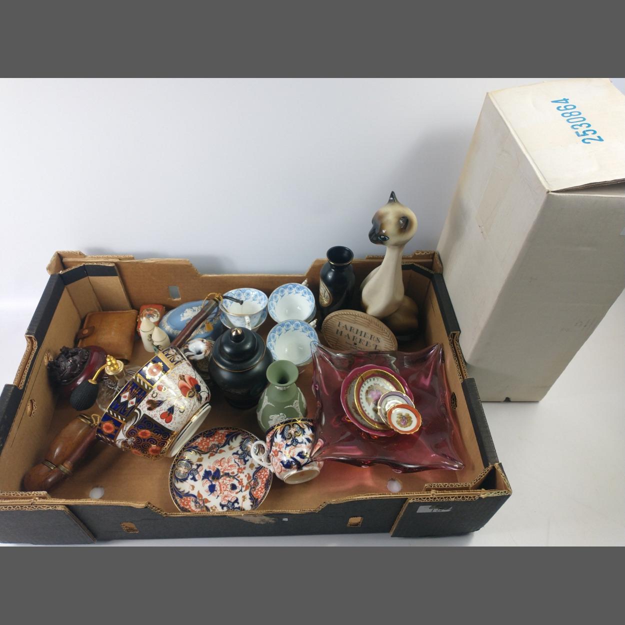 A mixed box to include 6 dainty ROYAL WORCESTER teacups (1 repaired with staples), a MEERSCHAUM pipe (35cm long), a WEDGWOOD jasperware posy vase, four small LIMOGES plates, a statuette of a Siamese cat (approx 28cm high) and a boxed PELLINGTON clock of a clown with a bird etc
