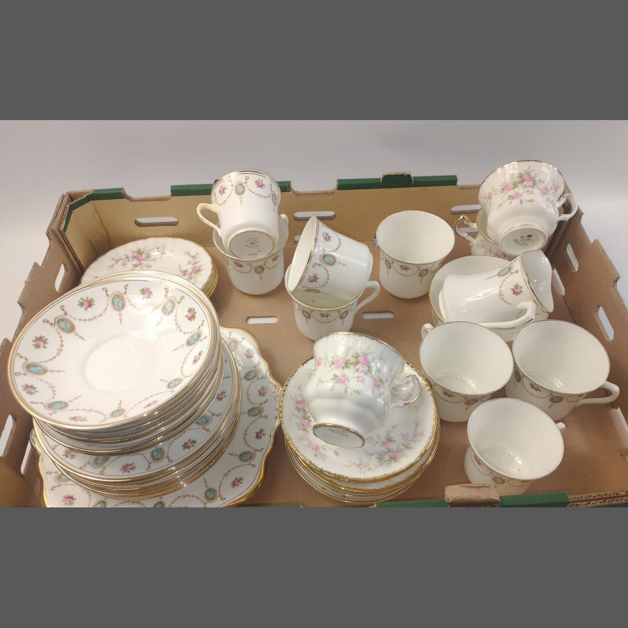 A part ROYAL ALBERT service comprising 5 teacups, 3 coffee cups, 9 large saucers (15cm dia) and 5 smaller saucers (14cm dia), 14 side plates, 2 cake plates, 1 milk jug and 1 sugar bowl and also three ROYAL ALBERT Victoriana Rose trios
