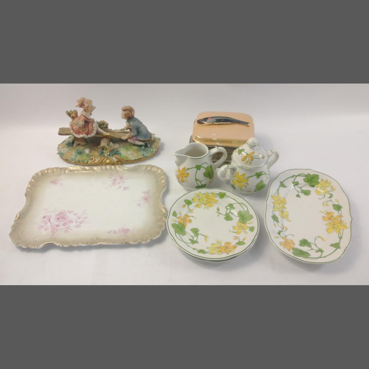 A mixed box with a VILLEROY & BOCH Geranium sandwich plate, 2 side plates lidded sugar bowl and milk jug, a CAPODIMONTE figurine of 2 children on a swing, and a butter dish in a white metal