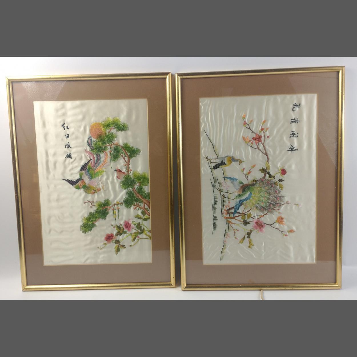 Two framed pictures embroidered on silk one of a bird of paradise frame size 54x40cm approx (portrait); the other of a peacock 54x40cm (landscape)