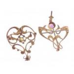 Two 9ct stamped brooches, the first in heart-shape form with an amethyst stone centred and seed pearls gross weight 2.43g approx with also another heart-shaped form pendant with a green citrine style stone again with seed pearls gross weight 2.35g approx