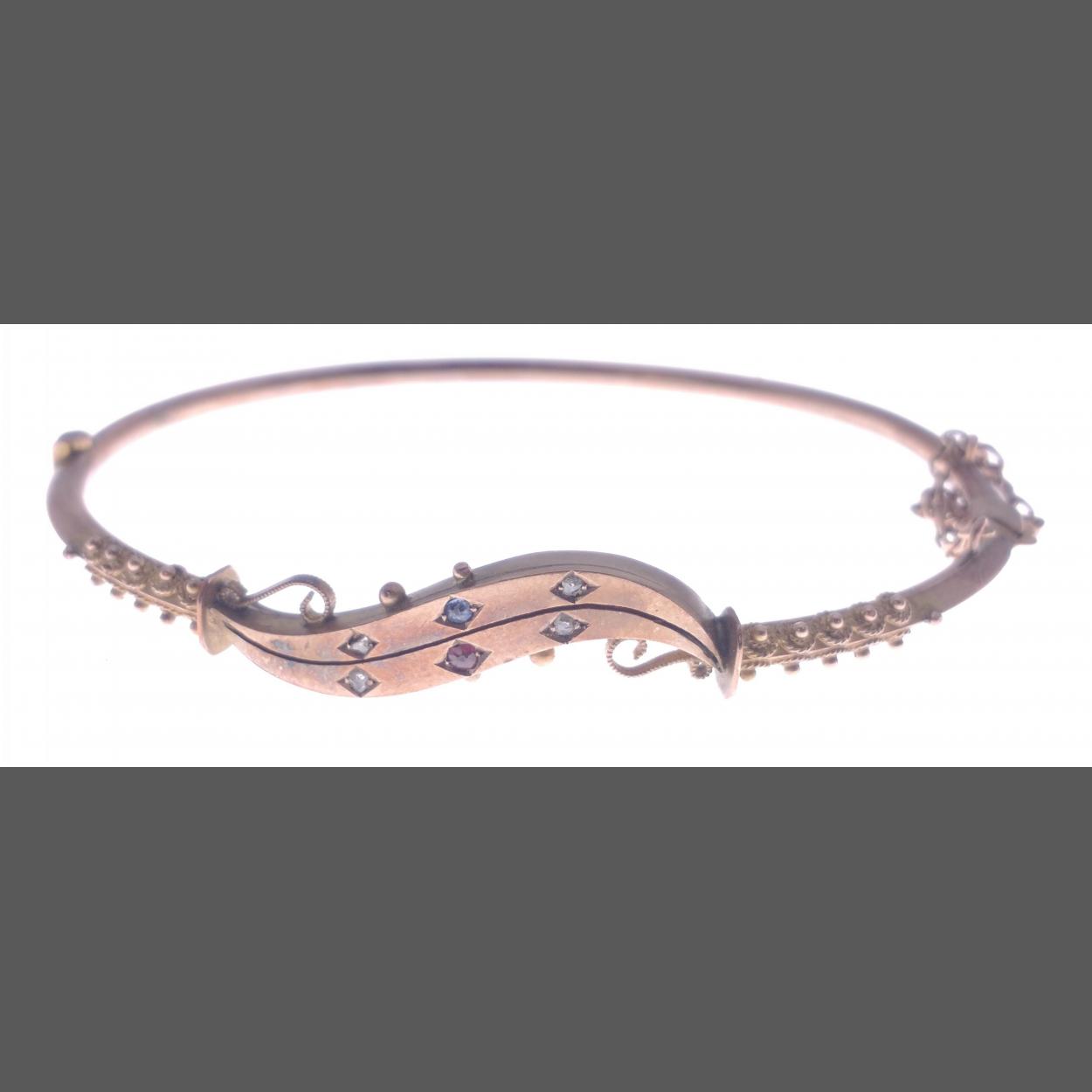 EXQUISITELY CRAFTED CHESTER hallmarked 375 stamped vintage snap-shut yellow gold bracelet with tiny precious stones inset to include diamonds (tested) with a tiny sapphire and garnet also inset - gross weight 5.95g approx with original Bergana Bros Sunderland jeweller's presentation case lined in green satin