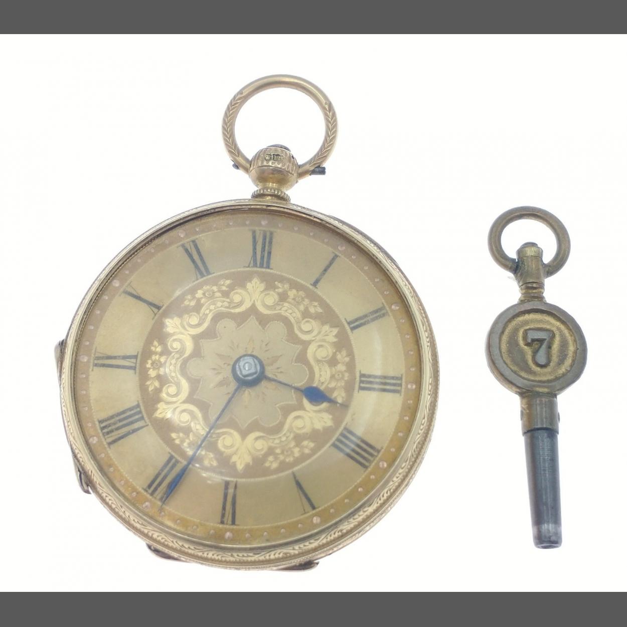 EXQUISITE! An 18ct stamped and hallmarked Sheffield - yellow gold bright-cut engraved cased ladies fob watch - the glass is loose and will require re-fixing and comes with its original winding key (stamped7) and what looks like the original jewellers presentation case - the watch was not working at the time of valuation - weight gross 45.45g