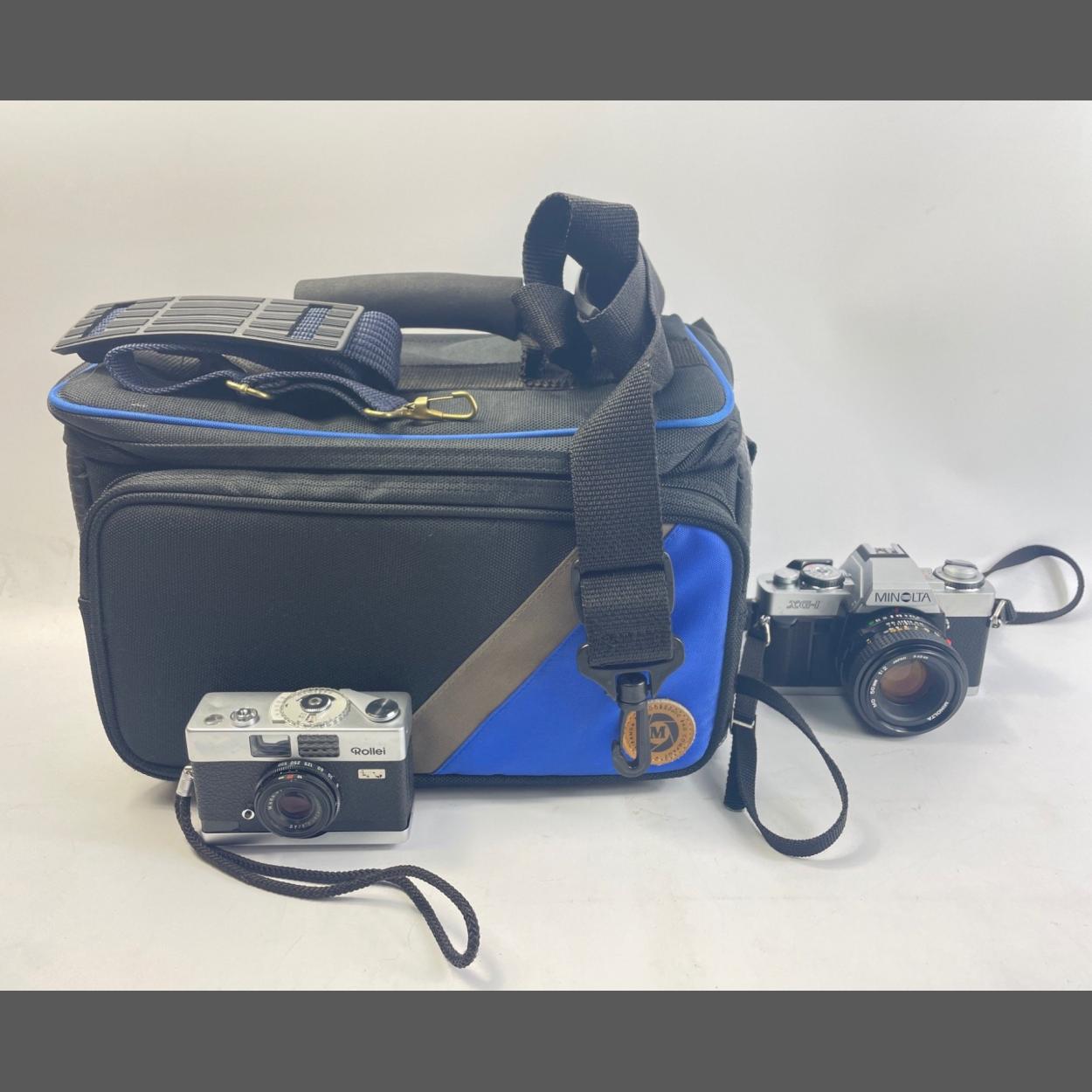 Photographic lot. A super clean MINOLTA XG-1 with MINOLTA MD50MM lens. Lot includes the substantial camera case, all straps and a little ROLLEI compact camera. A very well cared for camera little used and in excellent working order.