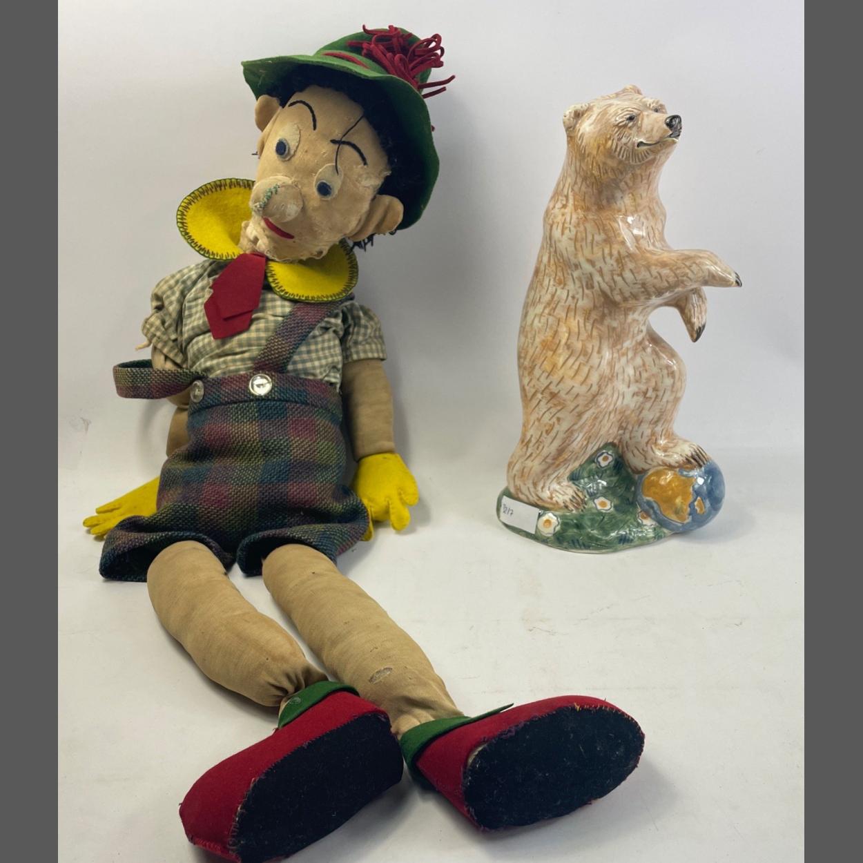 A hand-painted mantelpiece bear figurine, standing approx 35cm tall plus a handmade fabric Pinocchio doll approx 70cm long